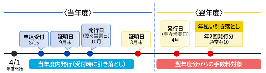 - 発行手数料は年次徴収となります。対象期間は4月~翌3月までで、引落日は毎年4月10日です。(休日の場合は翌営業日)